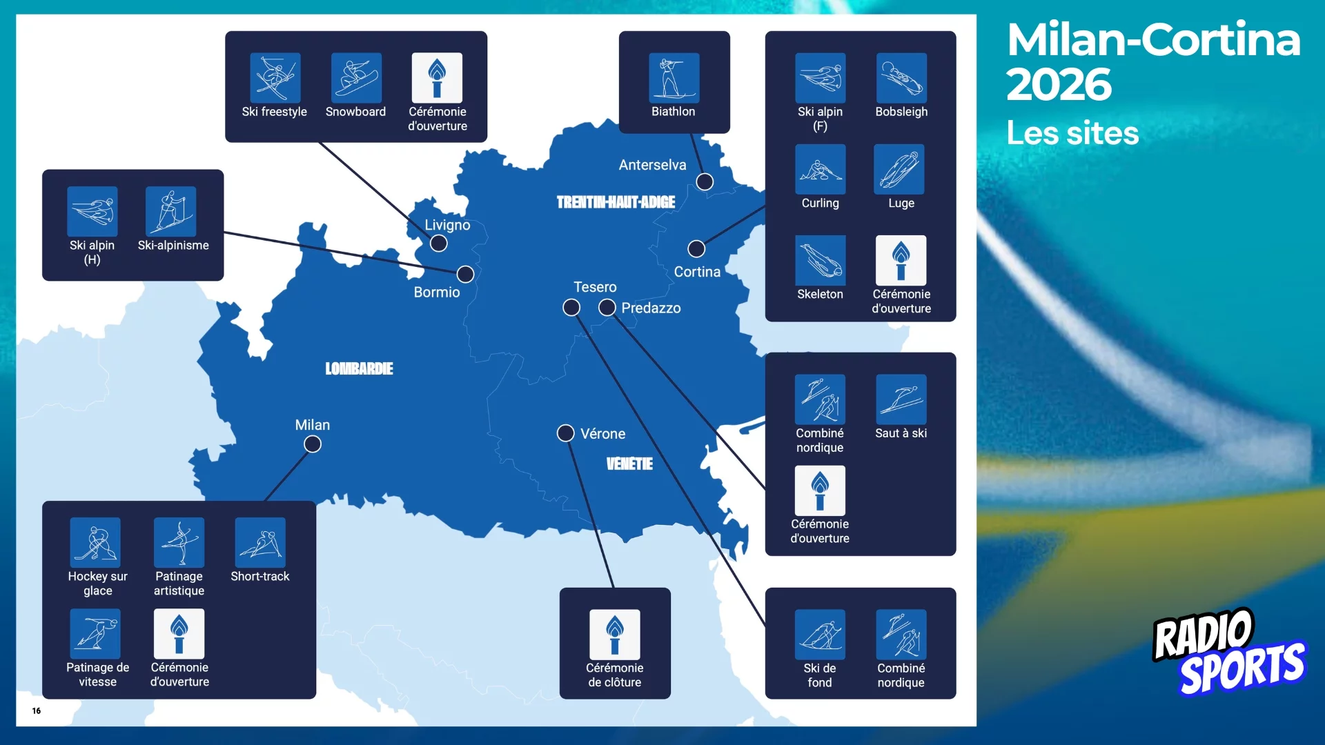 - Cortina d’Ampezzo → ski alpin, bobsleigh, luge, skeleton